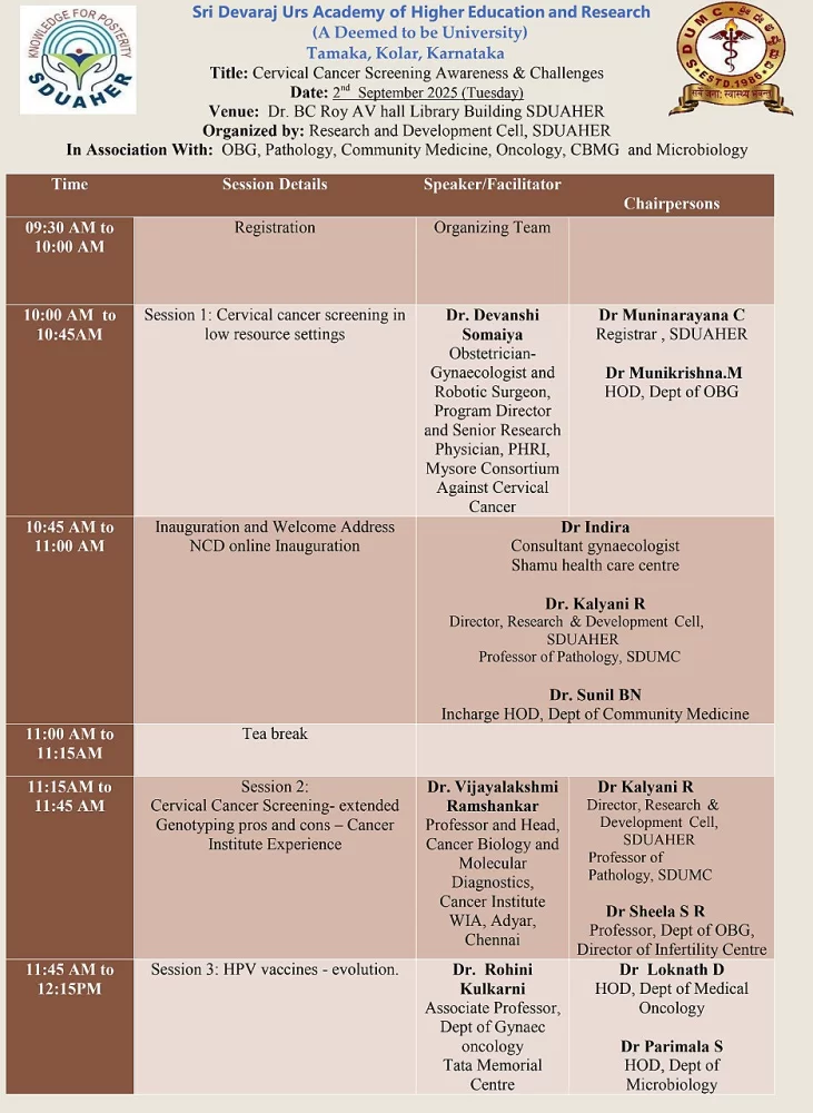 The department of R&D Cell in association with Pathology, Microbiology Community Medicine, OBG, Surgical Oncology, Radiation Oncology, Medical Oncology, SDUMC and CBMG, SDUAHER is organizing a CME on “Cervical Cancer Screening Awareness & Challenges” on 2nd September 2025 from 9:30 am to 1:30 pm at B C Roy Hall (Library A V hall).