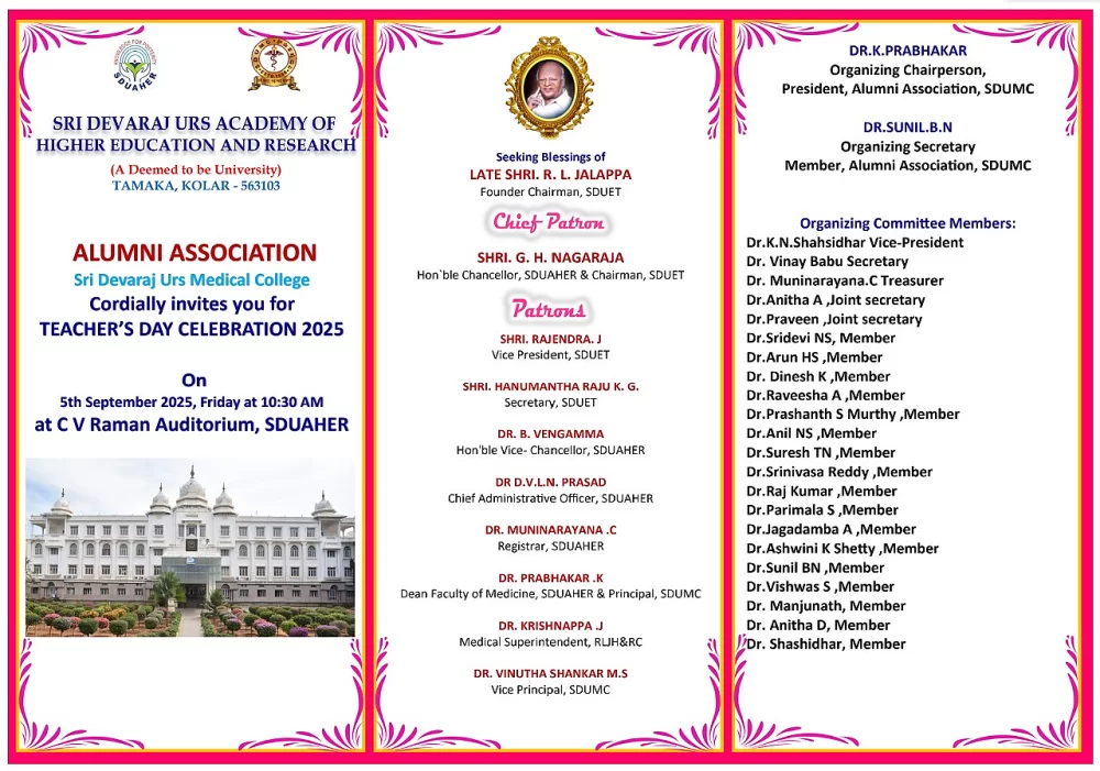 The Alumni Association of Sri Devaraj Urs Medical College is organising an event on the occasion of Teacher’s Day 2025. In India, Teacher’s Day is celebrated on September 5th every year, commemorating the birth anniversary of Dr. Sarvepalli Radhakrishnan, a distinguished teacher, philosopher, and the second president of India. The Theme for Teachers Day 2025 is ‘Empowering Educators: Strengthening Resilience, Building Sustainability’. Teachers’ Day is a unique occasion set aside to recognize and celebrate educators for their enormous contributions to both society and education.