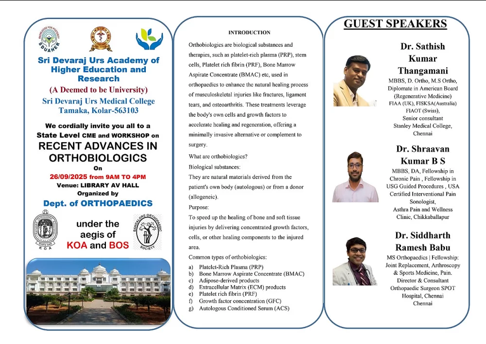 The Department of Orthopaedics, Sri Devaraj Urs Medical College is organizing a State Level CME and workshop on “RECENT ADVANCES IN ORTHOBIOLOGICS ” on 26thSeptember 2025 from 9:00 am to 4:00 pm at Library A V Hall.