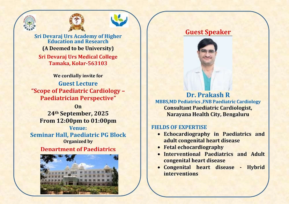 The Department ofPaediatrics, Sri Devaraj Urs Medical Collegeis organizing a Guest Lecture on “Scope of Paediatric Cardiology – Paediatrician Perspective” on 24th September 2025 between 12.00 pm to 1.00 pm at Seminar Hall, Paediatric PG Block.
