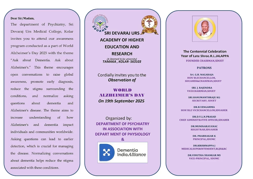 The Department of Physiology, Sri Devaraj Urs Medical College is conducting a webinar on “Breaking Silence, Reducing Stigma, Enabling Timely Care: Ask About Dementia, Ask About Alzheimer’s” on occasion of World Alzheimer's day on 19th September 2025 between 2 PM to 3 PM on Zoom platform.