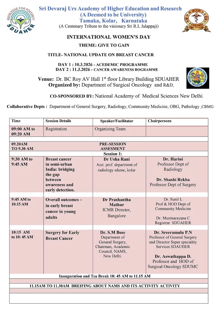 The Department of Pathology, Sri Devaraj Urs Medical College is conducting 21stAnnual National Pathology CME on “Immunohistochemistry Update: Patterns, Panels and Practical insights” on 14.03.2026 from 8:00 am to 4:30 pm at William Osler hall, SDUMC.
