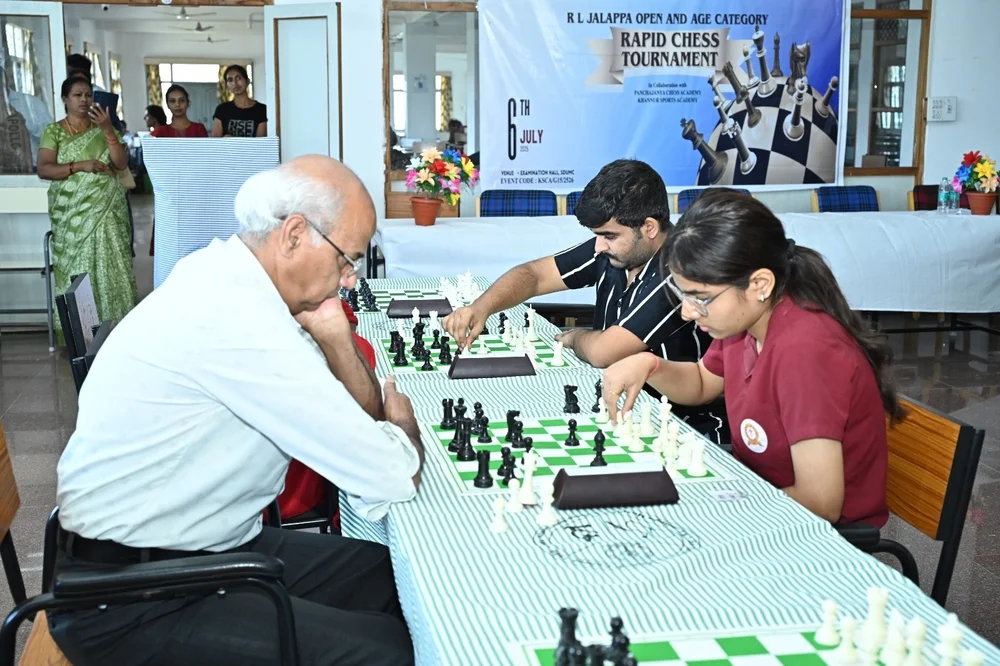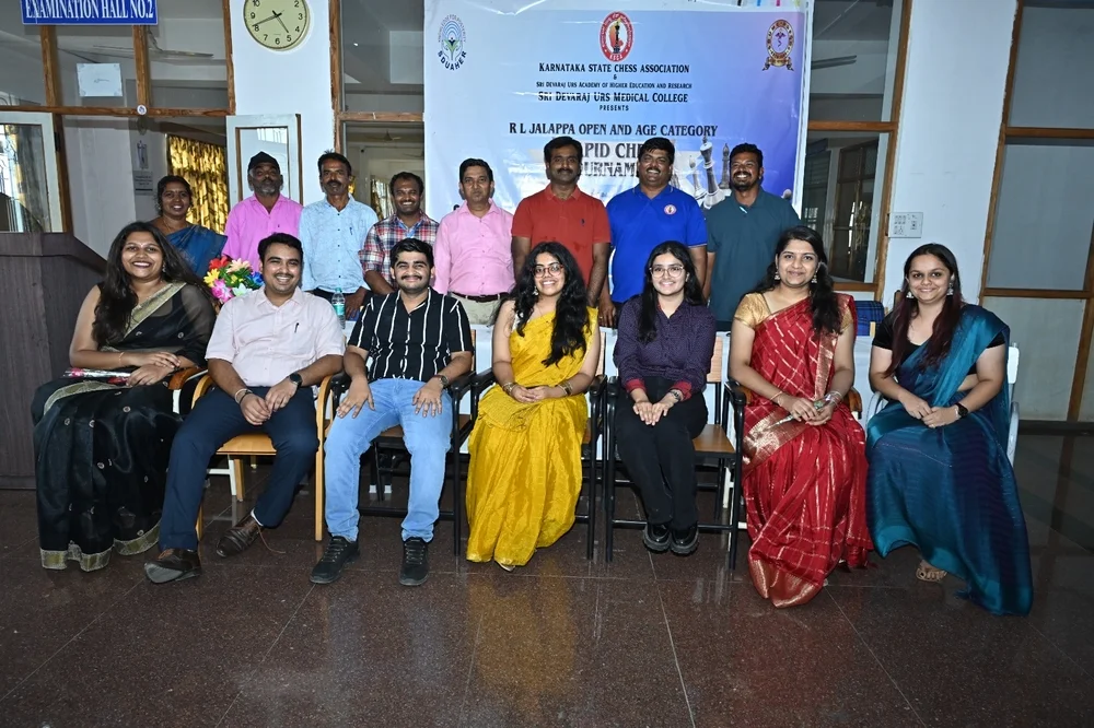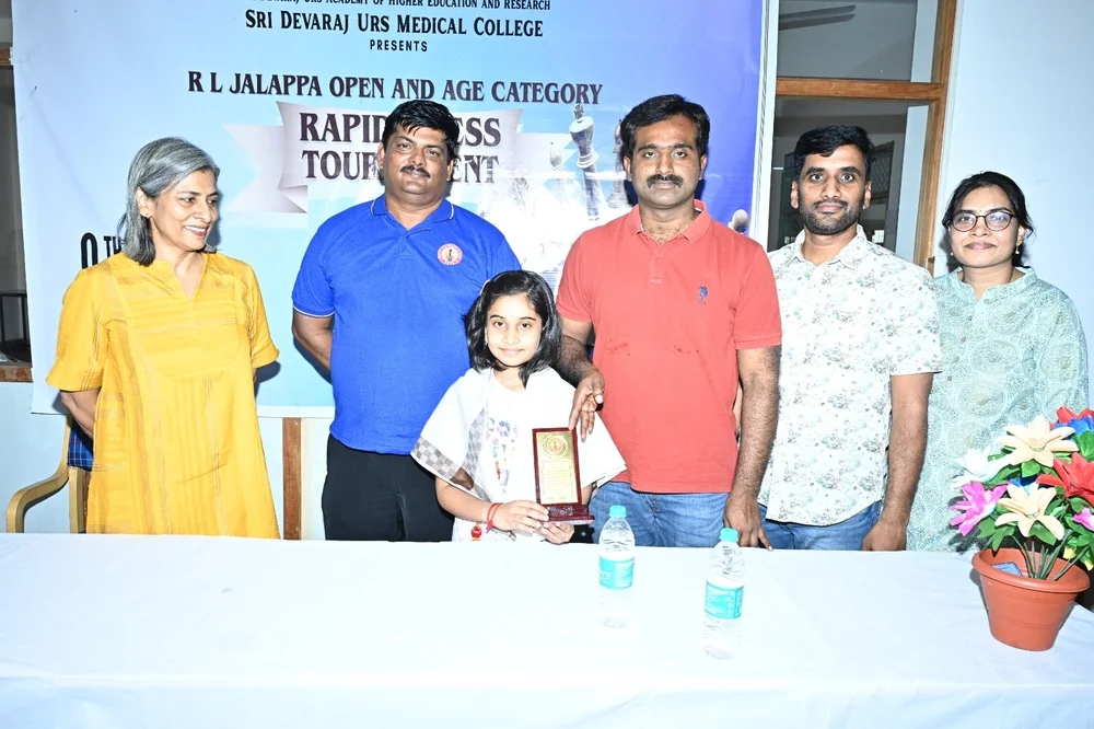 Karnataka State Chess Association in Collaboration with Sri Devraj Urs Academy of Higher Education and Research has organised R L Jalappa Open and Age Category Rapid Chess Tournament for Under 7, Under 10, Under 13 , Under 16 and Open Category at Sri Devraj Urs Medical College on 6th July 2025. More than 100 participants from all over the State and Neighbouring states took part in the Event. The event was Inaugurated by Dr Muninarayana C, Hon Registrar, SDUAHER, Mr. Suresh Babu, Vice President of Karnataka State Chess Association, Chief Arbiter Murugadundaram, Sports Convener Dr Sunil B N and under 9 National Silver Medalist Miss. Nakshatra graced and Inaugurated the Event.