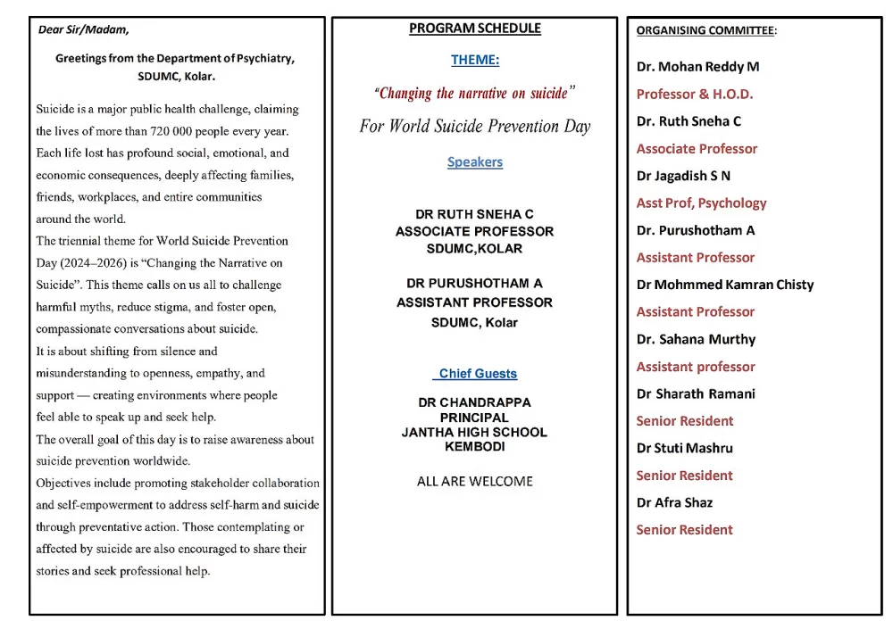 The department of Psychiatry ,SDUMC, conducted awareness program on 10/09/2025 on the event of world suicide prevention day with the theme, “Changing The Narrative On Suicide-Start The Conversation”. This triennial theme is with the call to action "Start the Conversation". It is about transforming how we perceive this